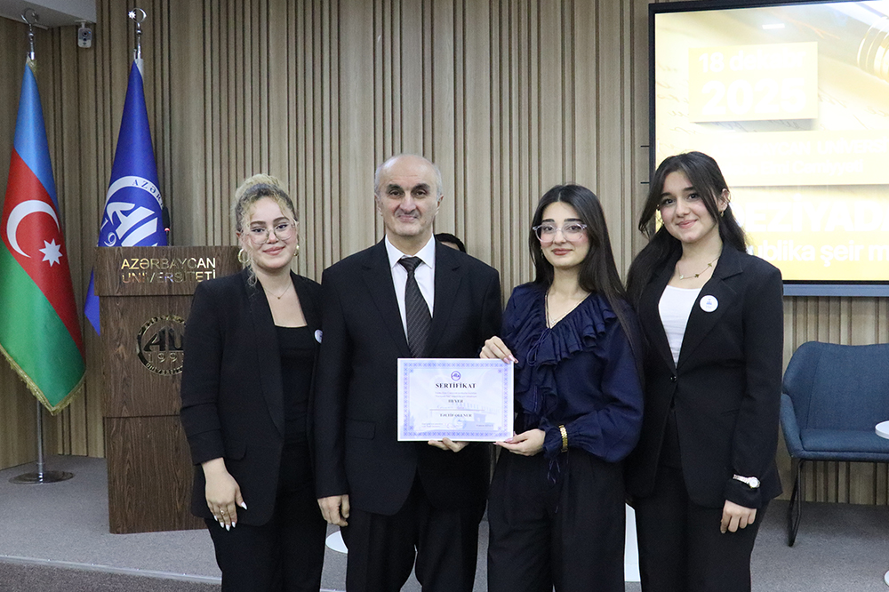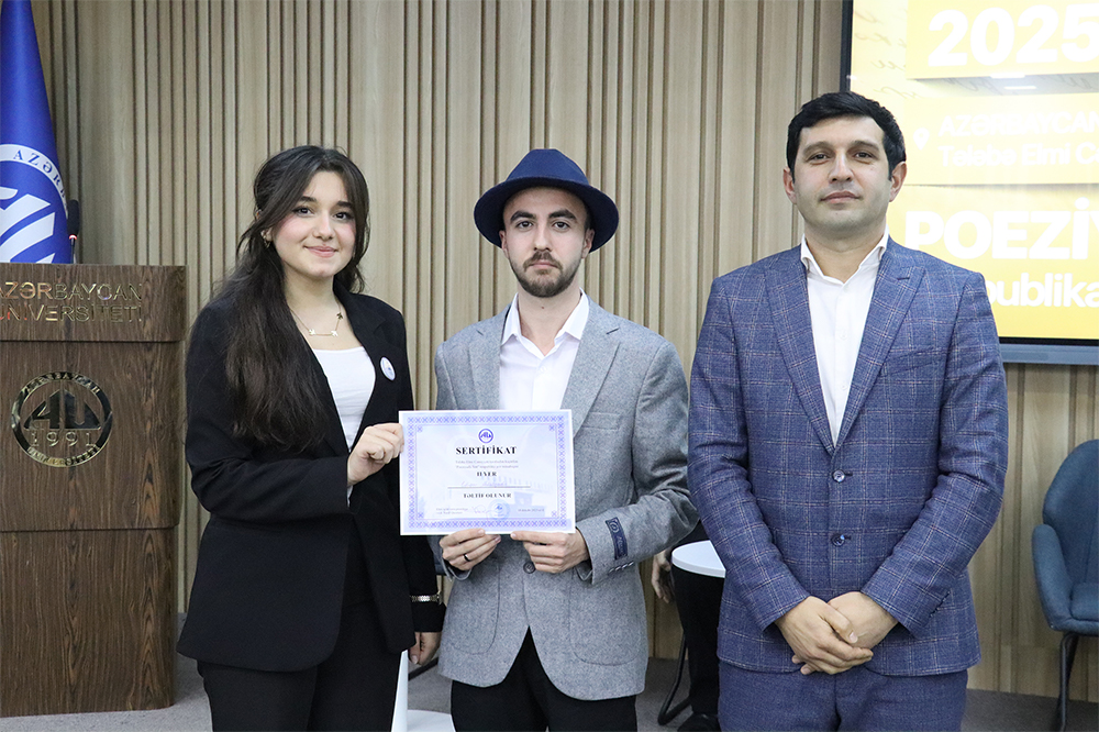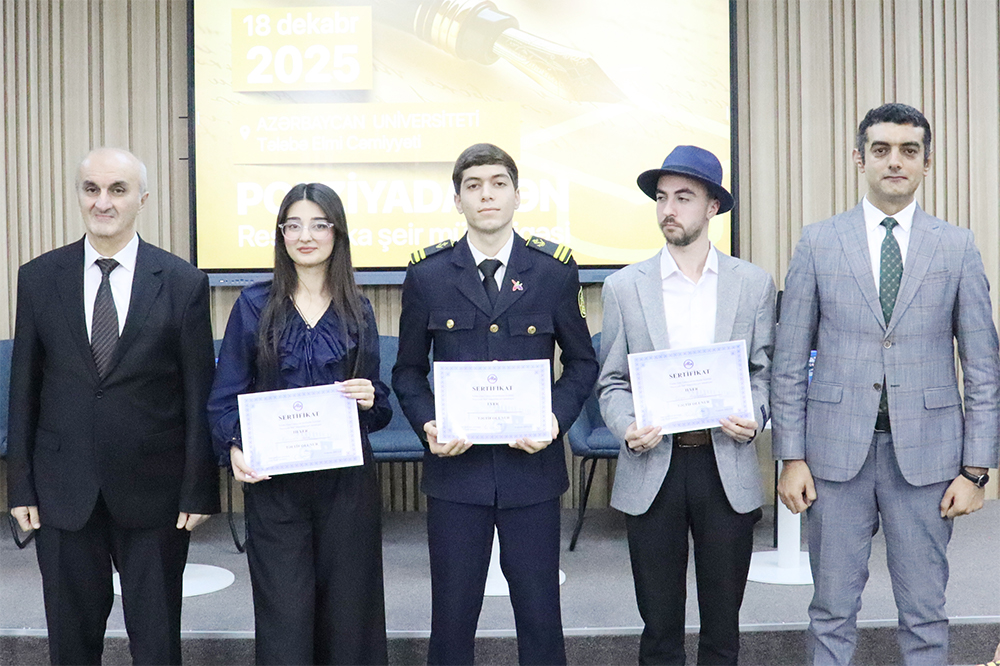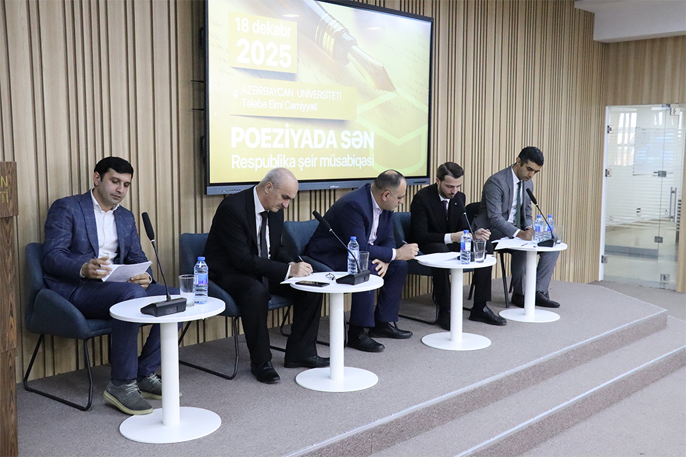 Azərbaycan Universitetinin Tələbə Elmi Cəmiyyəti tərəfindən gənclərin ədəbi-bədii yaradıcılığının təşviqi, milli poeziya ənənələrinin yaşadılması və təbliği məqsədilə “Poeziyada Sən” adlı respublika şeir müsabiqəsi keçirilib. Müsabiqənin əsas mərhələsində ölkədə fəaliyyət göstərən 8 ali təhsil müəssisəsindən 31 tələbə iştirak edib. İştirakçılar münsiflər heyəti qarşısında müəllifi olduqları şeirləri səsləndiriblər.