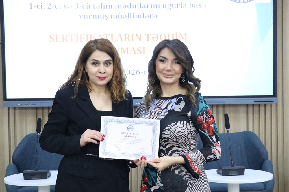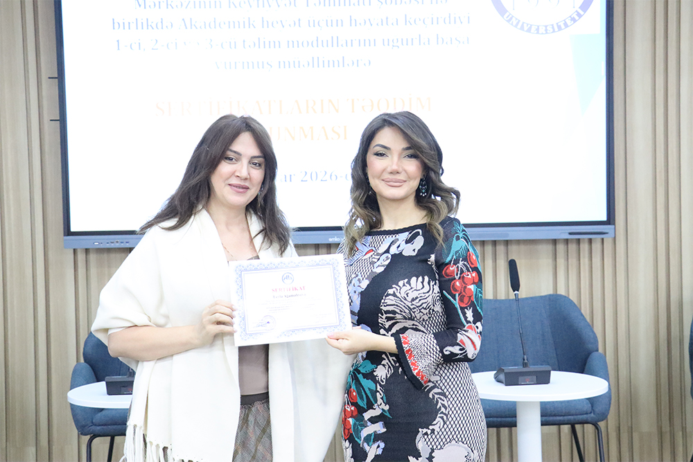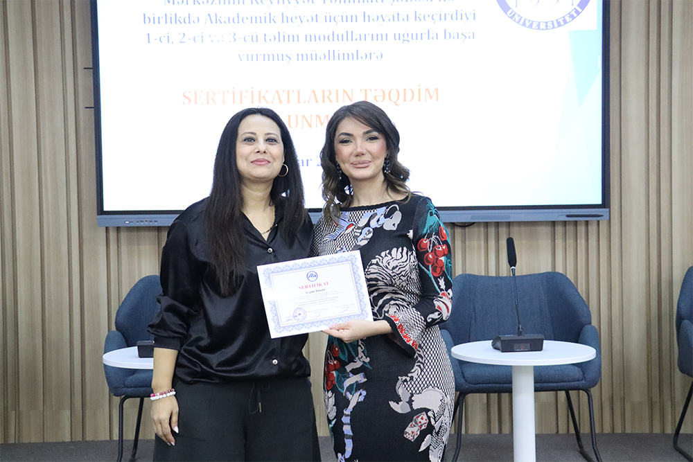 Ardınca sertifikat mərasiminə start verilib. Akademik heyət üzvlərinin sertifikatlarını rektor Səadət Əliyeva, rektorun müşaviri Nüşabə Quliyeva, elmi işlər üzrə prorektor Yusif Qasımov və Tədris şöbəsinin müdiri Leyla Ağamalıyeva təqdim ediblər.