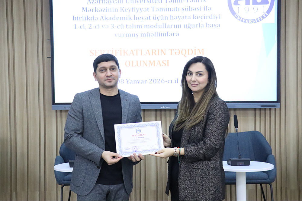 Azərbaycan Universitetinin Ömürboyu təhsilə dəstək: Təlim-Tədris Mərkəzi və Keyfiyyət təminatı şöbəsinin cari tədris ili ərzində universitetin akademik heyəti üçün pedaqoji kompetensiyaların yüksəldilməsi məqsədilə həyata keçirdiyi təlim modullarını uğurla başa vuran müəllimlərə sertifikatlar təqdim olunub. Tədbirdə Azərbaycan Universitetinin rektoru, filologiya üzrə fəlsəfə doktoru Səadət Əliyeva, elmi işlər üzrə prorektor, riyaziyyat elmləri doktoru Yusif Qasımov, rektorun müşaviri, tarix üzrə fəlsəfə doktoru, dosent Nüşabə Quliyeva, dekanlar, şöbə müdirləri, professor-müəllim heyəti, inzibati heyət üzvləri iştirak edib.