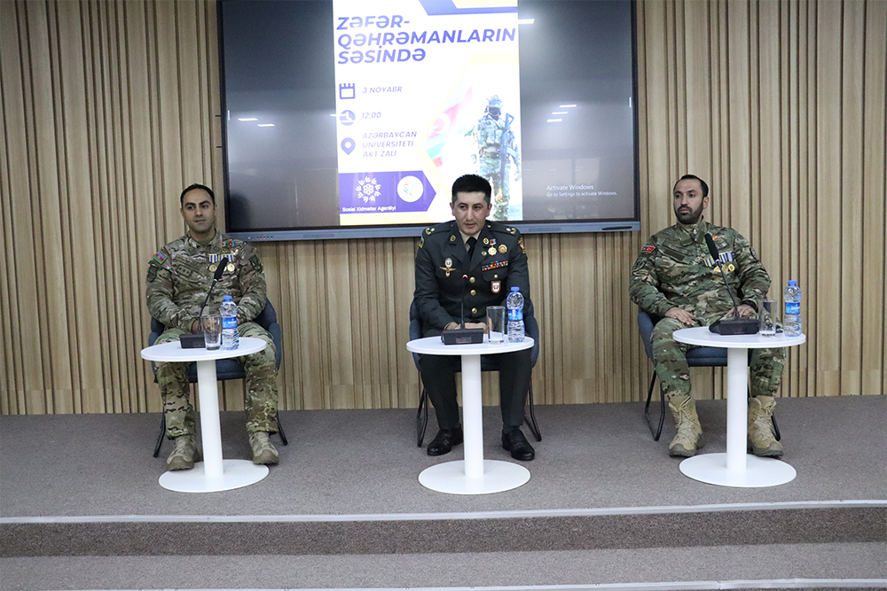 Azərbaycan Universitetində Sosial işin təşkili kafedrasının nəzdində fəaliyyət göstərən “Sossfera” Sosial İnkişaf Klubu, Əmək və Əhalinin Sosial Müdafiəsi Nazirliyi tabeliyində Sosial Xidmətlər Agentliyinin birgə təşkilatçılığı və Vətən müharibəsi qəhrəmanlarının iştirakı ilə diskussiya formatında tədbir təşkil olunub. Tədbirdə Vətən müharibəsi qəhrəmanları Qəzənfər Ağayev, Ramazan Hudulov və müharibə iştirakçısı Fərid Bağırlı iştirak ediblər.