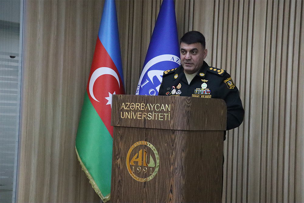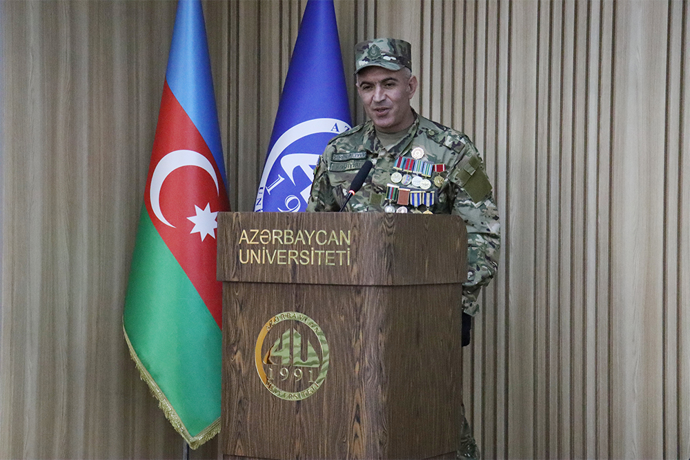 Azərbaycan Universitetində 8 Noyabr – Zəfər Gününə həsr olunmuş növbəti tədbir keçirilib. Tədbirin qonaqları “Qarabağ” ordenli polkovnik Rəşad Aslanov, Vətən müharibəsi qaziləri Şirin Alıyev və Qismət Əliyev olub. Qonaqlar tədbir başlamazdan əvvəl universitetin elmi işlər üzrə prorektoru Yusif Qasımov ilə birlikdə Qarabağ Zəfərinin 5-ci ildönümünə həsr olunmuş sərgiyə baxış keçiriblər. Sərgidə hər günü bir qəhrəmanlıq dastanı olan Vətən müharibəsinin gedişatı xronoloji ardıcıllıqla təqdim olunur və 44 slayd nümayiş etdirilir.