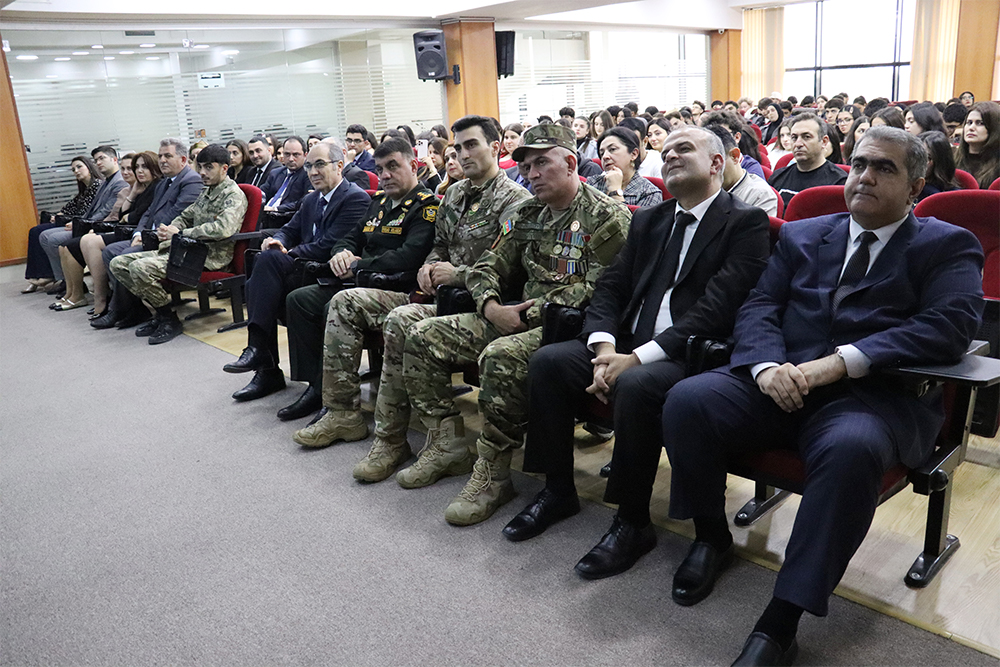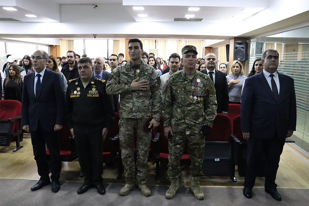 Universitetin akt zalında davam edən tədbirdə Dövlət Himni səsləndirilib, şəhidlərin xatirəsi bir dəqiqəlik sükutla yad edilib.