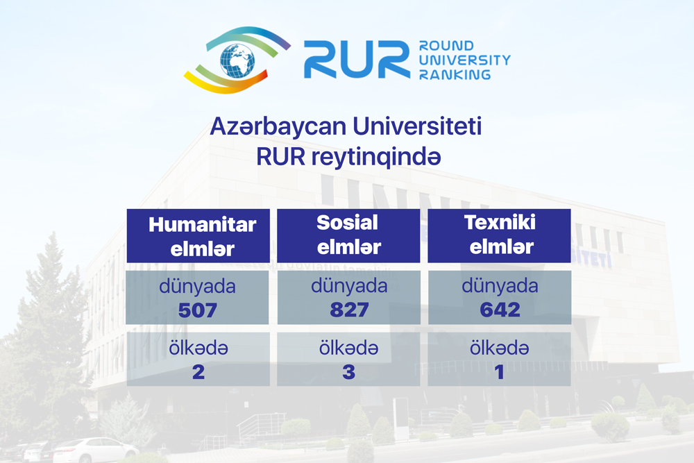 Belə ki, ali təhsil müəssisələrinin fəaliyyətini beynəlxalq standartlara uyğun qiymətləndirmək üçün yaradılmış nüfuzlu reytinq platformalarından biri olan “Round University Ranking” (RUR) reytinqində (2025 RUR Fənn Reytinqi) universitet ön sıralarda yer alıb. Agentliyin yenilənmiş göstəricilərinə əsasən Azərbaycan Universiteti cədvəldə humanitar elmlər üzrə dünyada 507-ci, ölkədə 2-ci yerdə; sosial elmlər üzrə dünyada 827-ci, ölkədə 3-cü yerdə; texniki elmlər üzrə isə dünyada 642-ci, ölkədə isə 1-ci yerdə qərarlaşıb. Ümumi göstəricilərə əsasən isə universitet ölkə üzrə 4-cü yerdədir və ötənilki mövqeyini qorumağa davam edir.