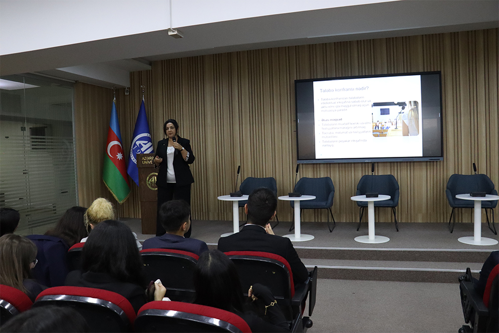 Tədbirin əsas hissəsində isə Azərbaycan Universitetinin Elm şöbəsinin müdiri Lətifə Ağamalıyeva elmi tezis və məqalələrin yazılma qaydaları, məqalə strukturunun formalaşdırılması, akademik etika, plagiatın qarşısının alınması və elmi mənbələrlə işləmə prinsipləri barədə geniş təqdimatla çıxış edib.