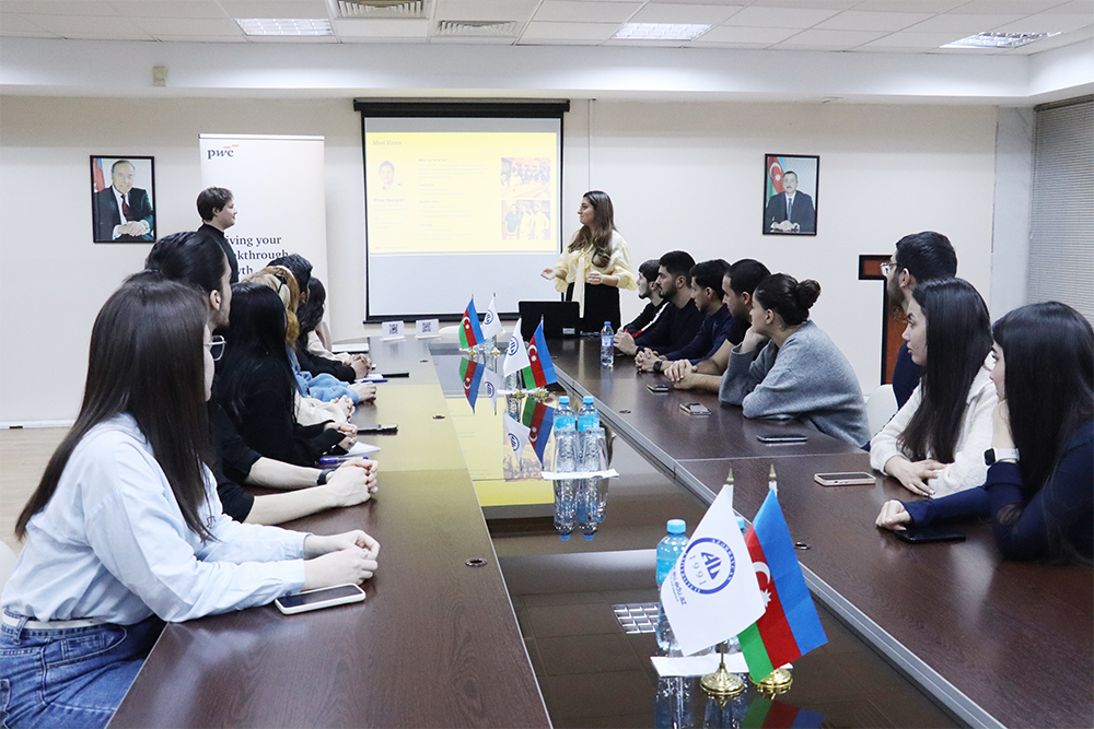Azərbaycan Universitetinin Biznes və iqtisadiyyat fakültəsinin ingilisdilli ixtisaslarında təhsil alan sonuncu kurs tələbələri üçün “Karyera planlaması” fənni çərçivəsində dünyanın aparıcı konsaltinq şirkətlərindən biri olan “PricewaterhouseCoopers (PwC) Azerbaijan” şirkətinin nümayəndələri ilə görüş təşkil olunub. Görüşdə şirkətin Marketinq, kommunikasiya və biznesin inkişafı qrup rəhbəri Səma Salmanova, Marketinq, kommunikasiya və biznesin inkişafı üzrə mütəxəssis Elmar Heydarov təqdimatla çıxış ediblər.