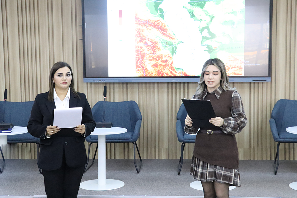 Ardınca TEC sədri Aytən Aslanova, sədr müavini Nəzrin Məmmədzadə, tələbələr Aygül Fərhadzadə və Nərmin Abdullayeva Xəzər dənizinin qurumasının səbəbləri, Azərbaycan iqtisadiyyatına və regional münasibətlərə təsiri, ekoloji əməkdaşlığın zəruriliyi və bu kimi mövzular haqqında hazırladıqları təqdimatlarla çıxış ediblər.